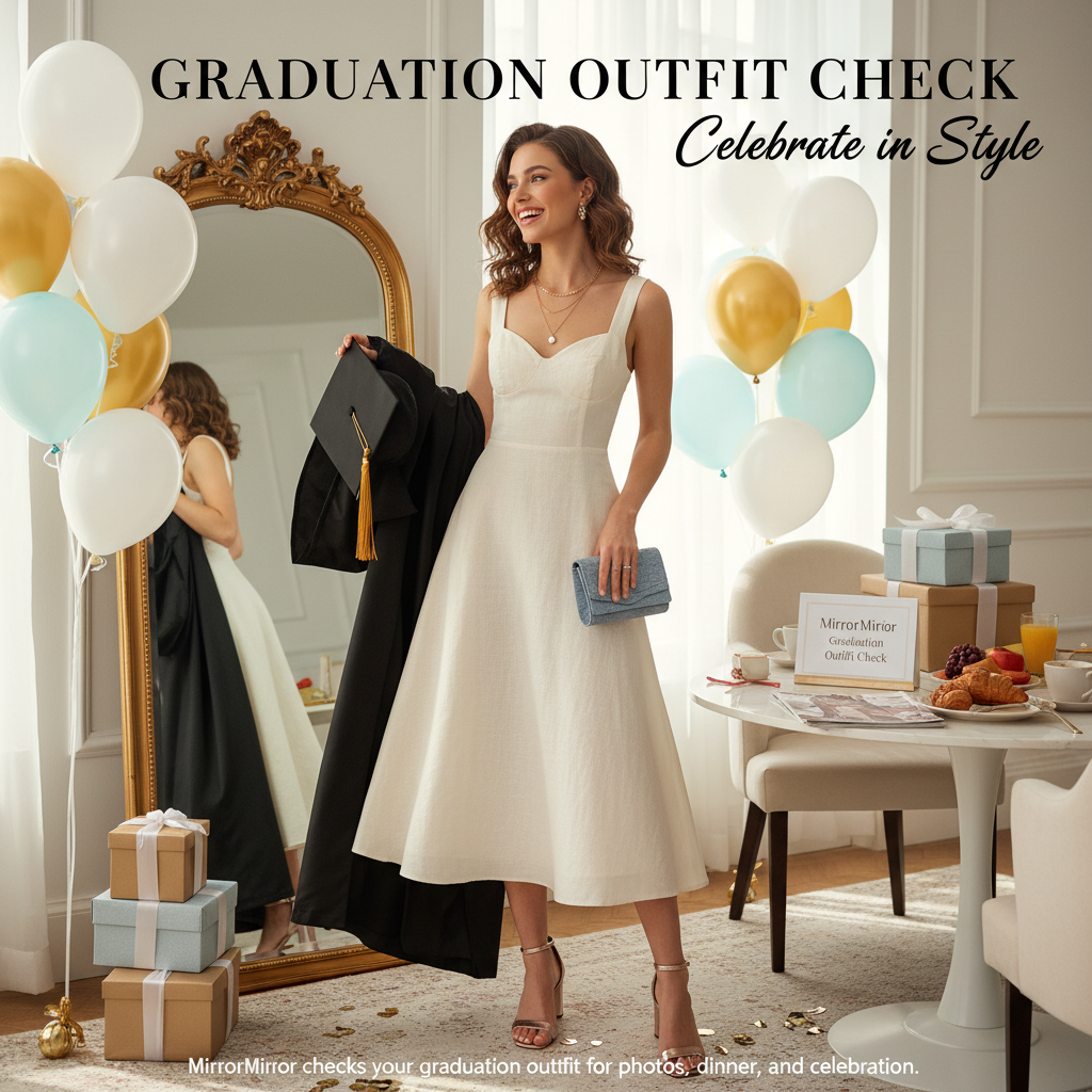 Cap and gown cover a lot, but not everything. MirrorMirror checks your graduation outfit for photos, dinner, and celebration.