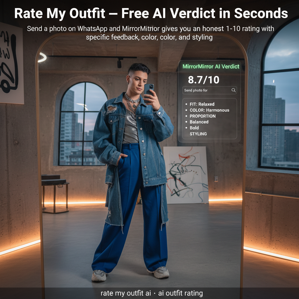 Send a photo on WhatsApp and MirrorMirror gives you an honest 1-10 rating with specific feedback on fit, color, proportion, and styling.