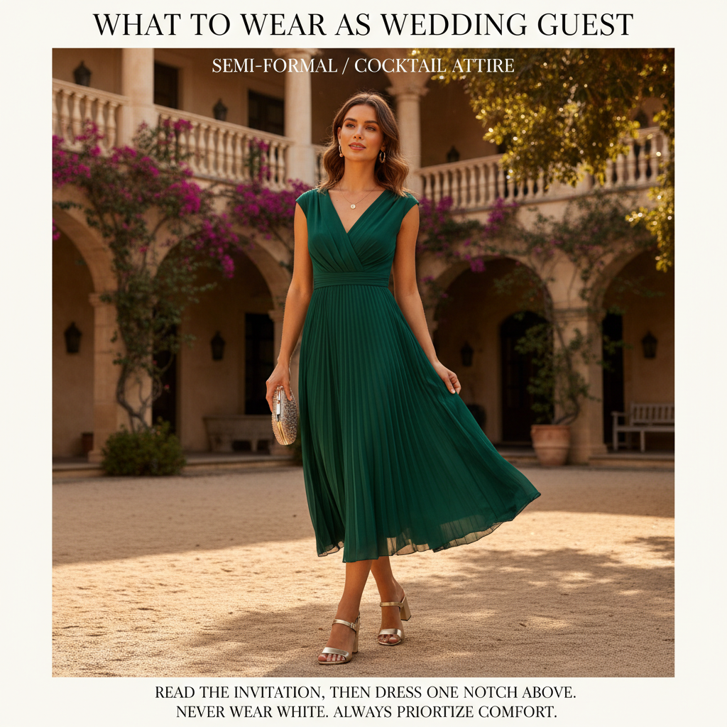Read the invitation, then dress one notch above what you think is expected. When in doubt, go slightly more formal. Never wear white, never upstage the couple, and always prioritize comfort because you will be on your feet for hours.